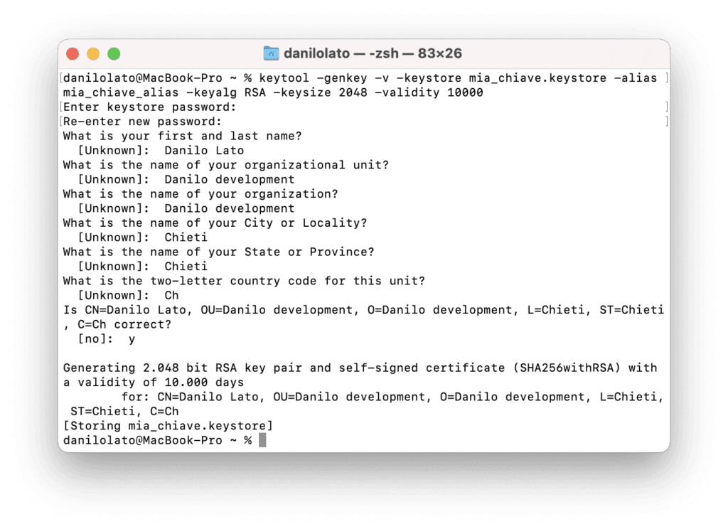 Una volta lanciato il comando ci verrà richiesta una password (da non dimenticare!) e una serie d'informazioni da inserire (nome, cognome, città, …). Completiamo inserendo tutti le informazioni richieste e il risultato nel terminale dovrebbe essere il seguente.